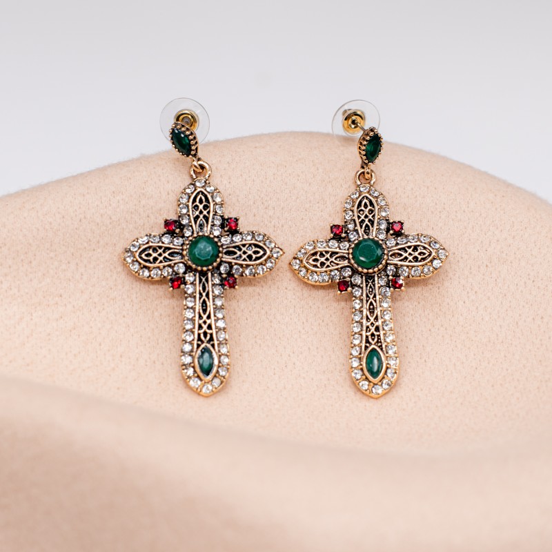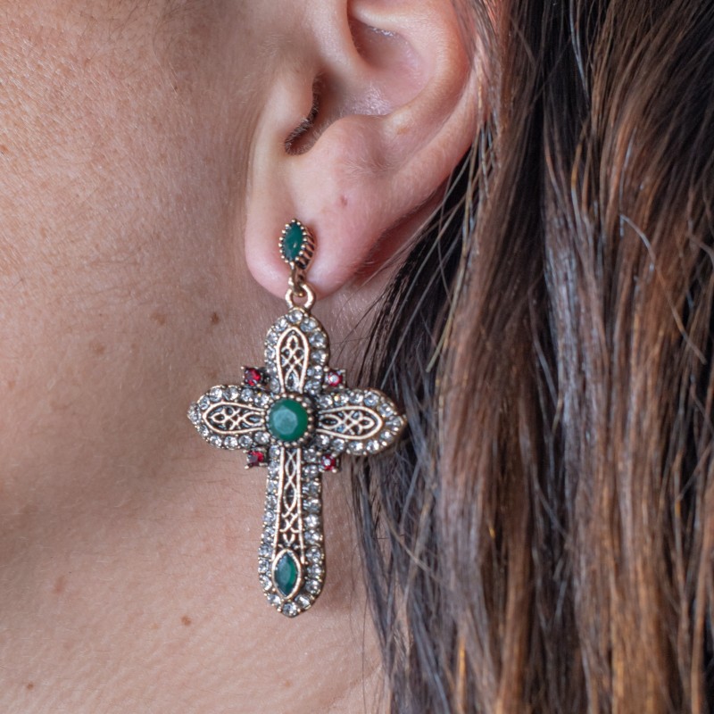 Magnifiques Boucles d'oreilles baroques en forme de croix et fleurs sculptées au style espagnol et flamenco.