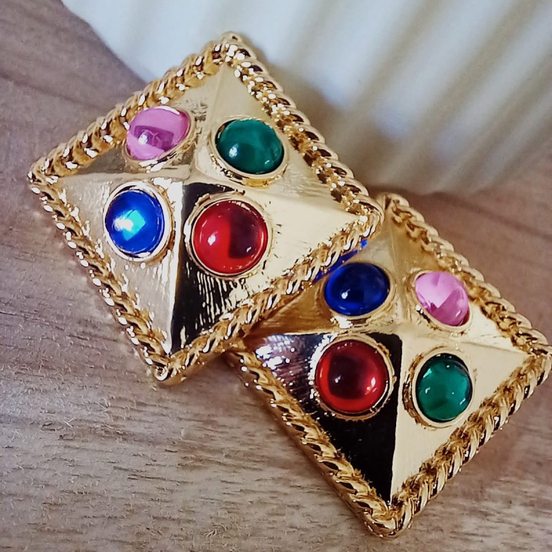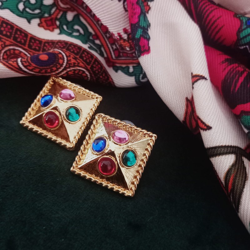 Une paire de boucles d'oreilles vintage. Inspirées des tendances de grands créateurs des années 80, ces boucles d'oreilles arborent des couleurs éclatantes grâce à leurs pierres de différentes couleurs et leur base dorée.