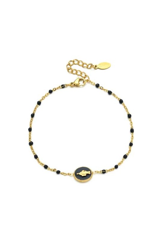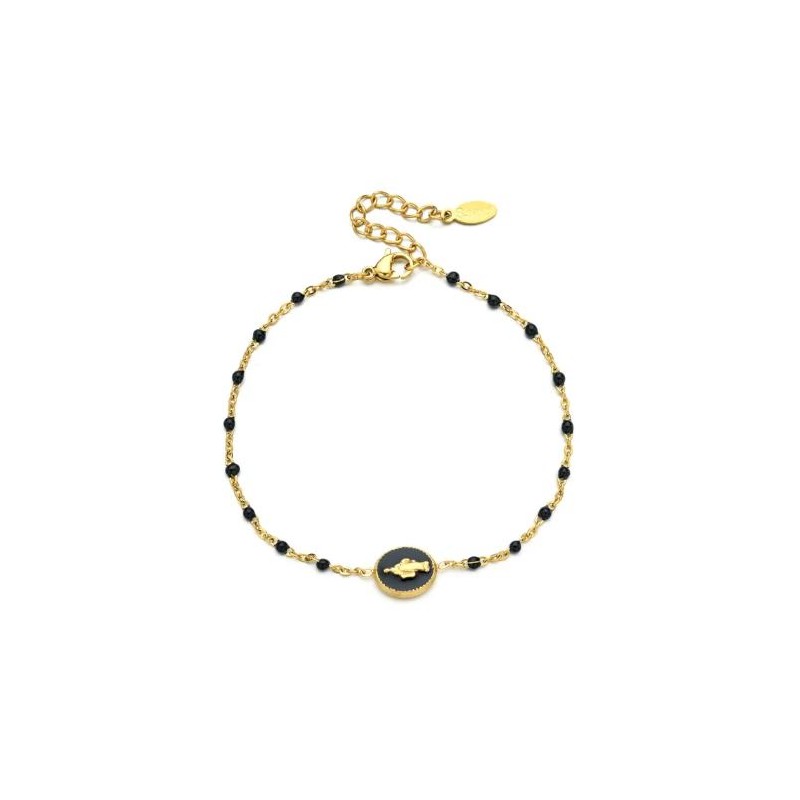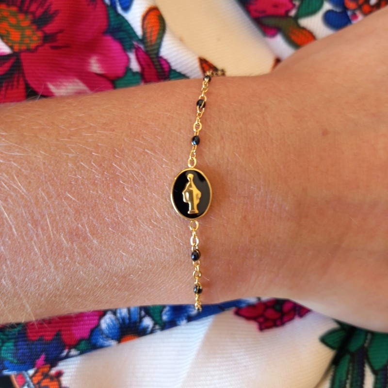 Bracelet Femme chaîne rosaire émaillé en acier inoxydable, chaîne or dorée, avec médaillon de la madone Vierge Marie.