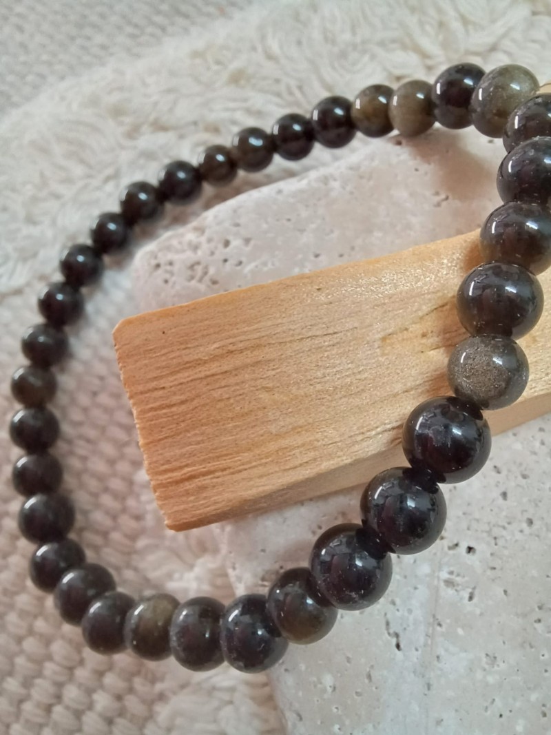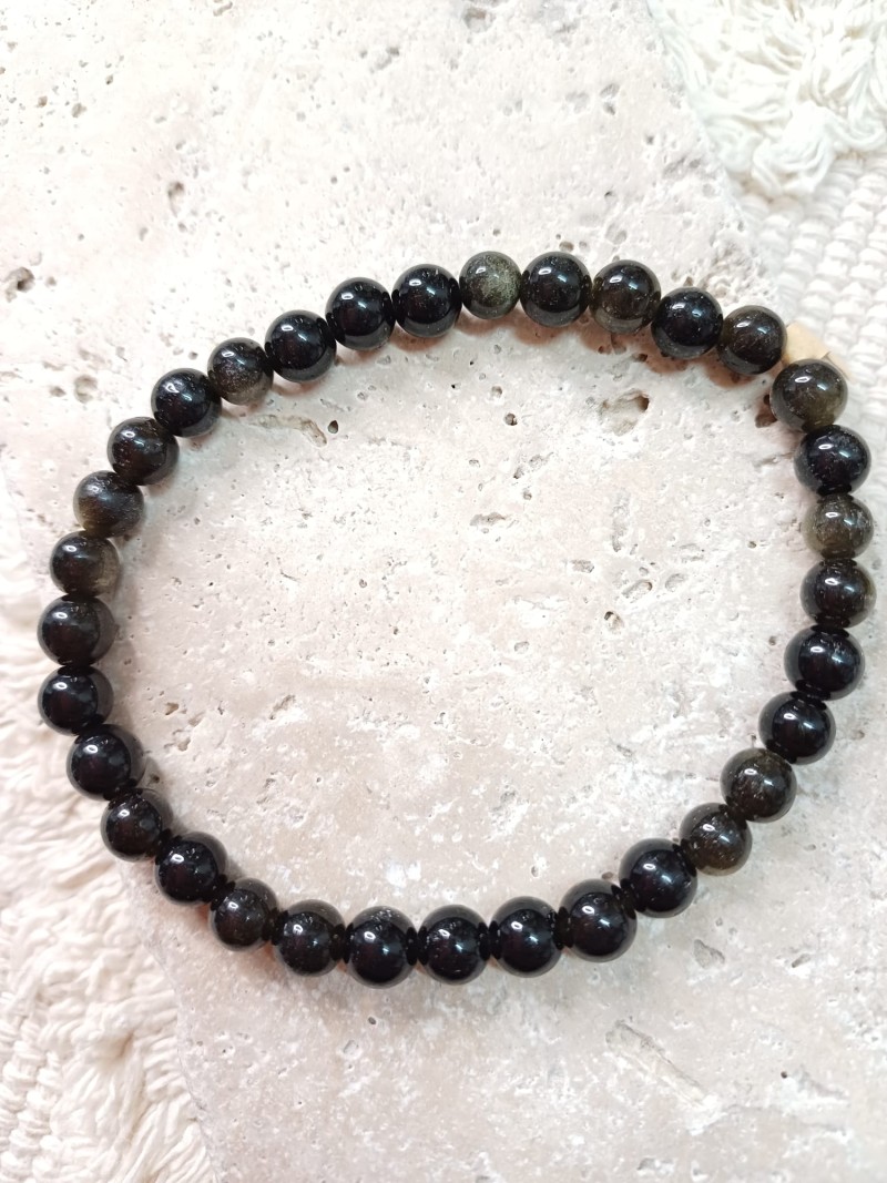 Porté au quotidien, le Bracelet Obsidienne Oeil Céleste 6mm diffuse en permanence l'énergie subtile de la pierre, favorisant la clairvoyance, la protection contre les énergies négatives et l'ancrage spirituel.