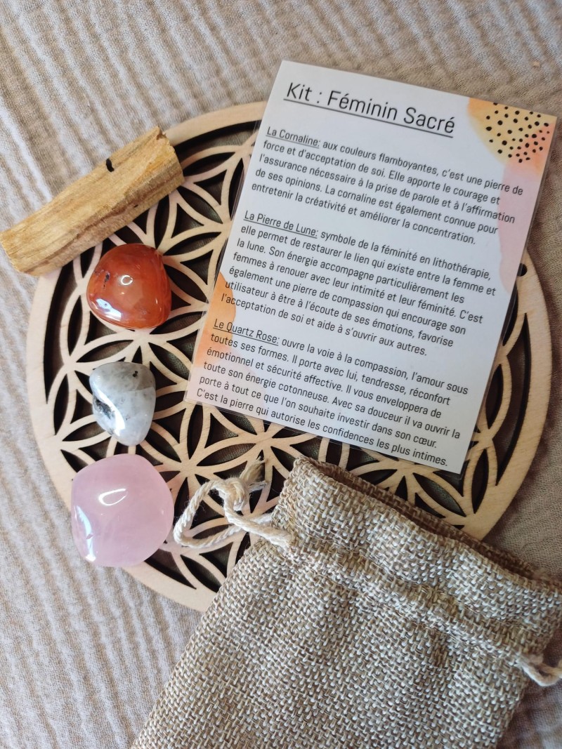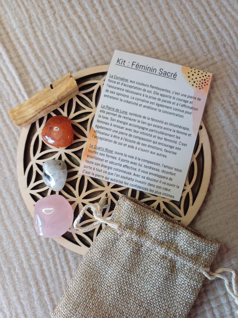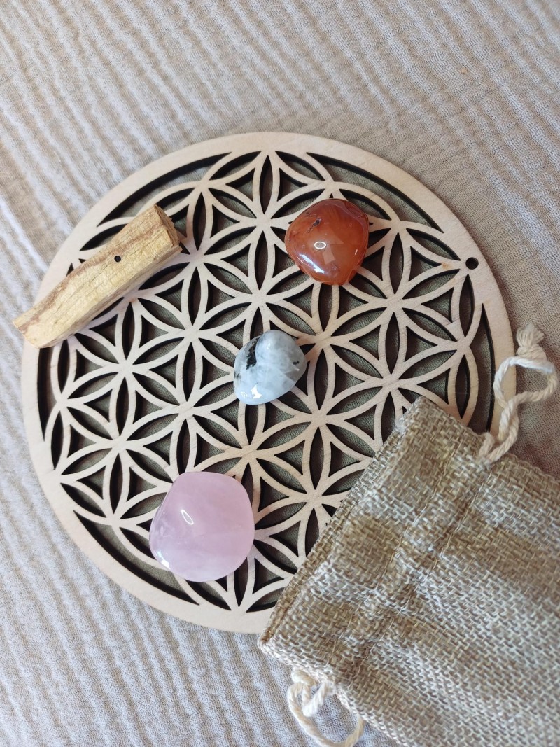 Kit de lithothérapie sur le Féminin Sacré: Une Cornaline, une pierre de Lune, Un Quartz Rose, un Palo Santo, Une fleur de vie