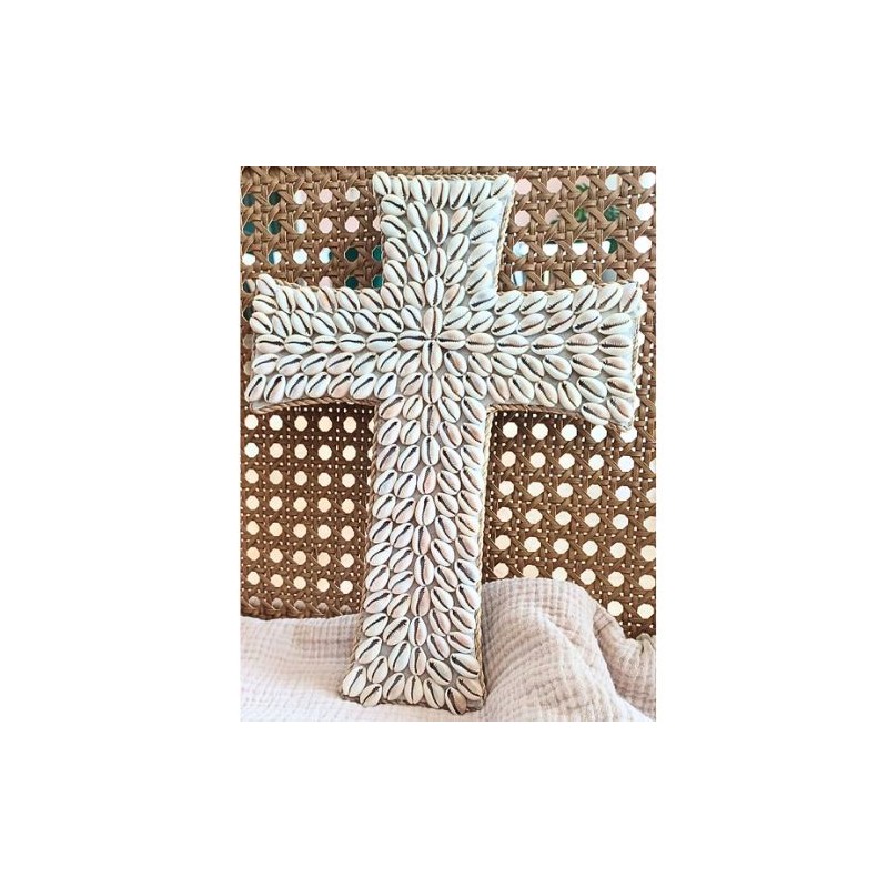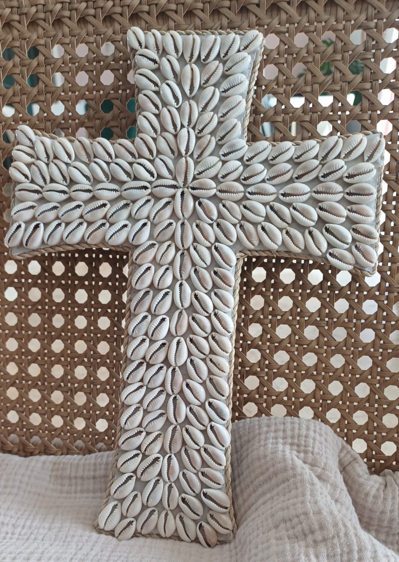 Faite à la main avec soin, cette croix est composée de coquillages soigneusement sélectionnés et assemblés pour créer un motif délicat.