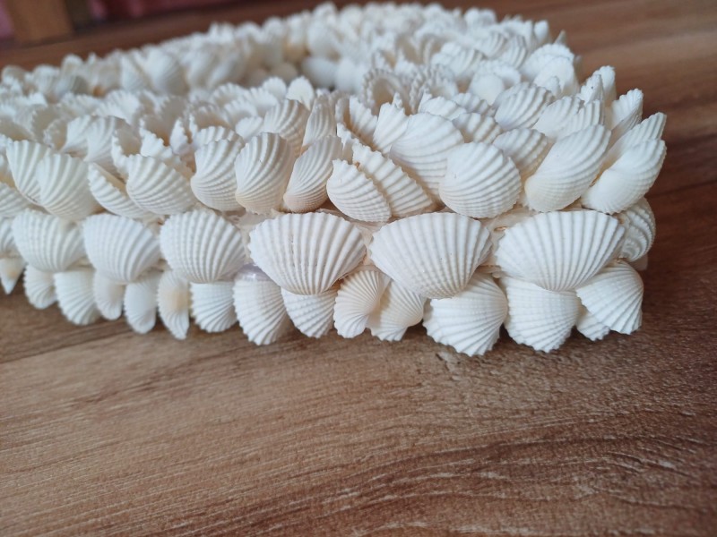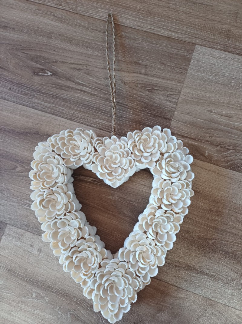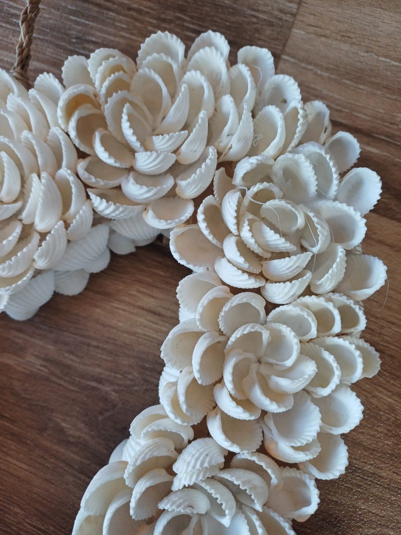 Faite à la main avec soin, cette croix est composée de coquillages soigneusement sélectionnés et assemblés pour créer un motif délicat.