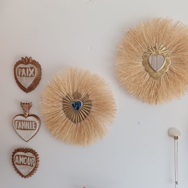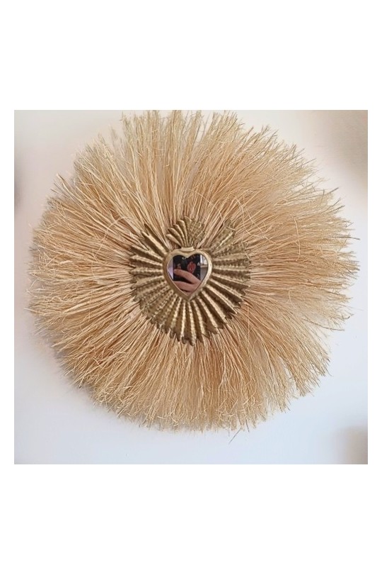 Apportez une touche de soleil et de sérénité à votre intérieur avec notre miroir soleil en raphia et cœur sacré.