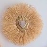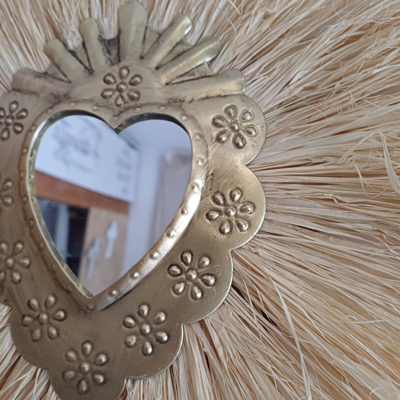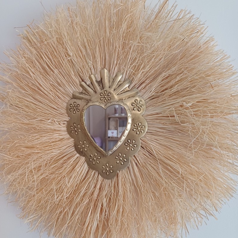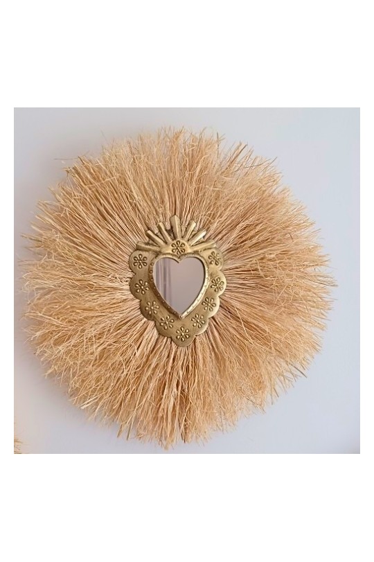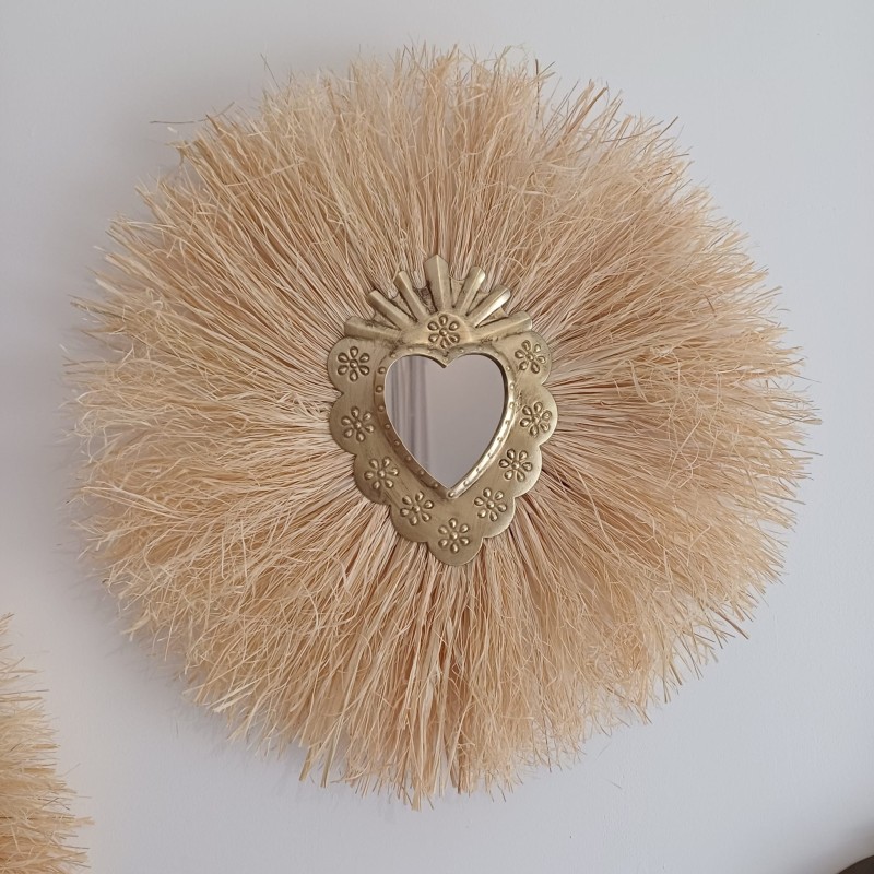 Offrez-vous une touche d'exotisme et de sérénité avec ce miroir soleil en raphia et cœur sacré.