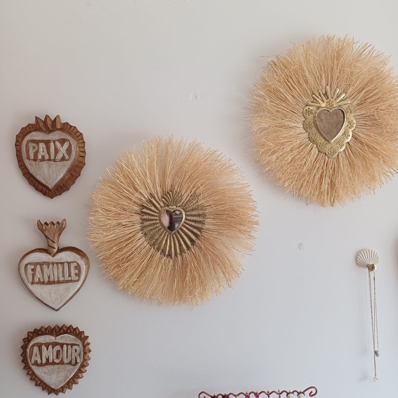 Apportez une touche de soleil et de sérénité à votre intérieur avec notre miroir soleil en raphia et cœur sacré.