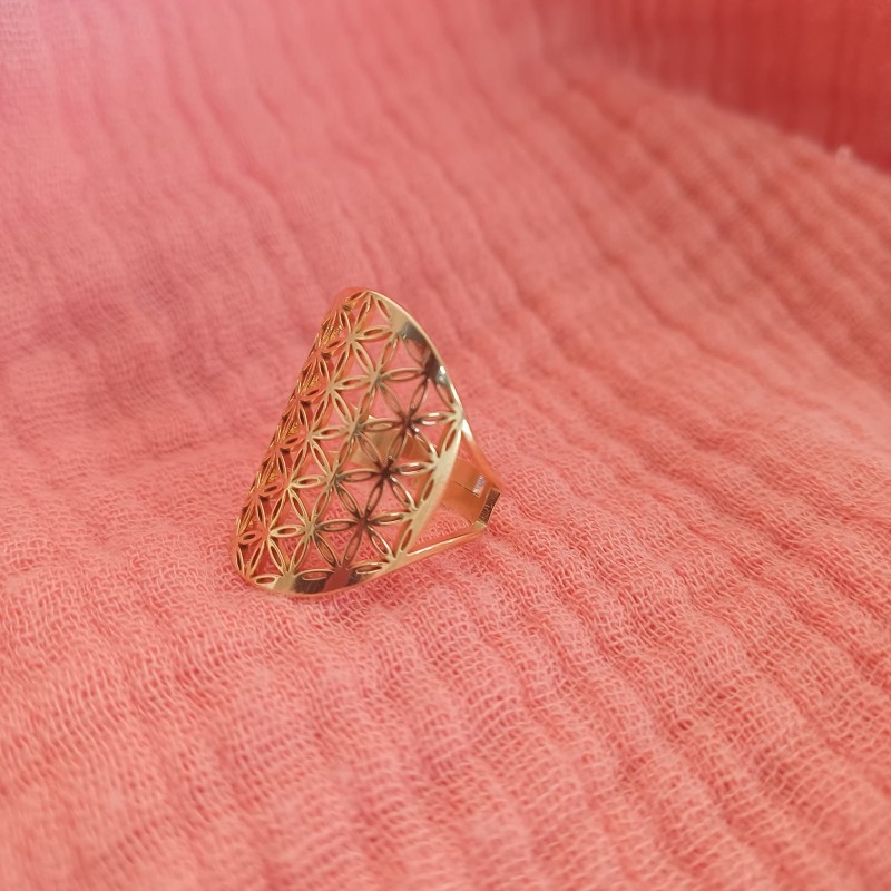 Affirmez votre style tout en profitant des bienfaits énergétiques de la Fleur de Vie avec cette magnifique bague en acier inoxydable doré.