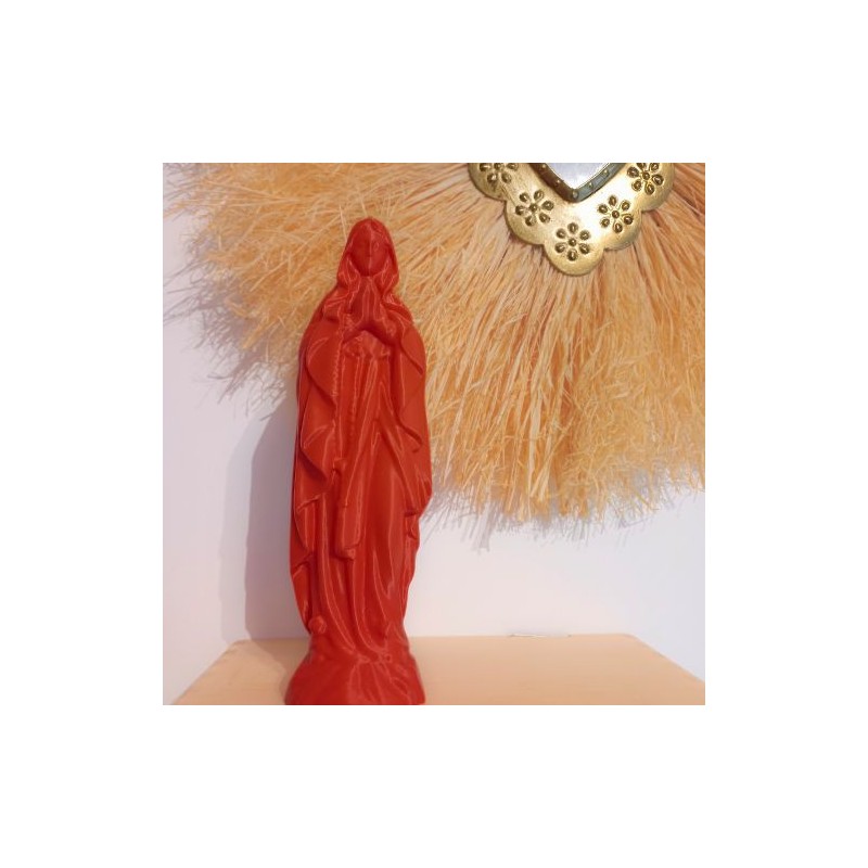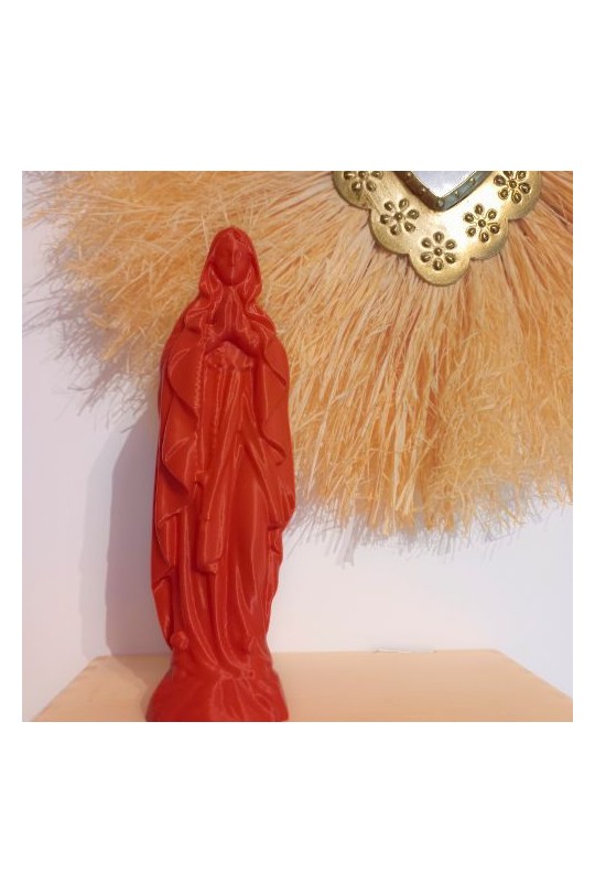 Imagine une Vierge au look totalement revisité : une silhouette traditionnelle, mais habillée de couleurs intenses