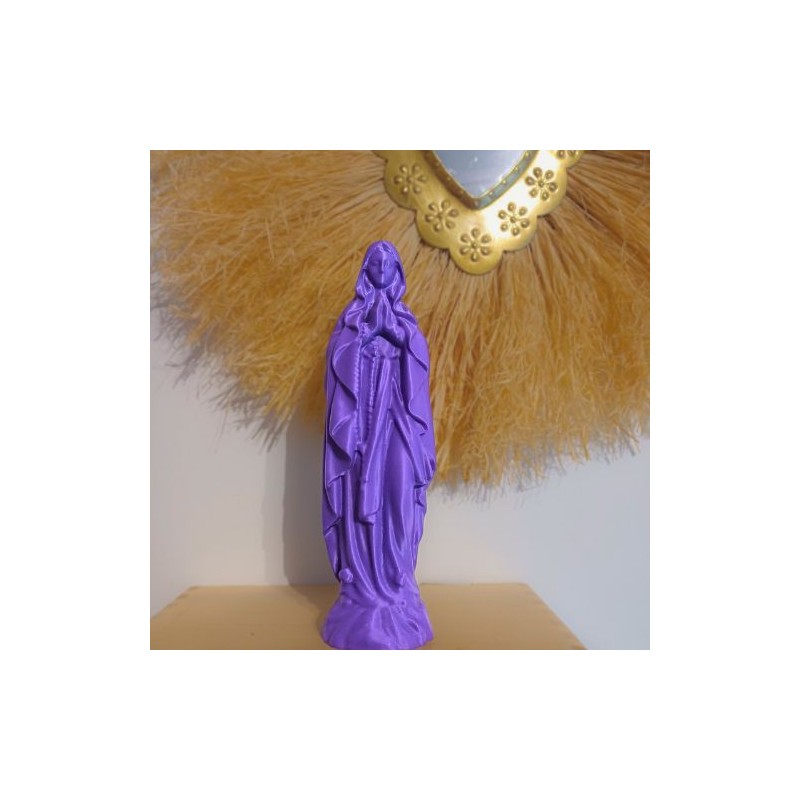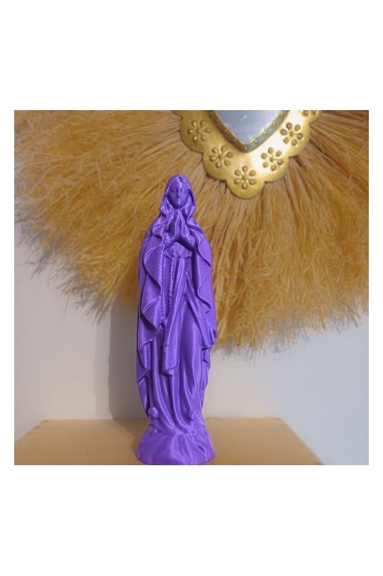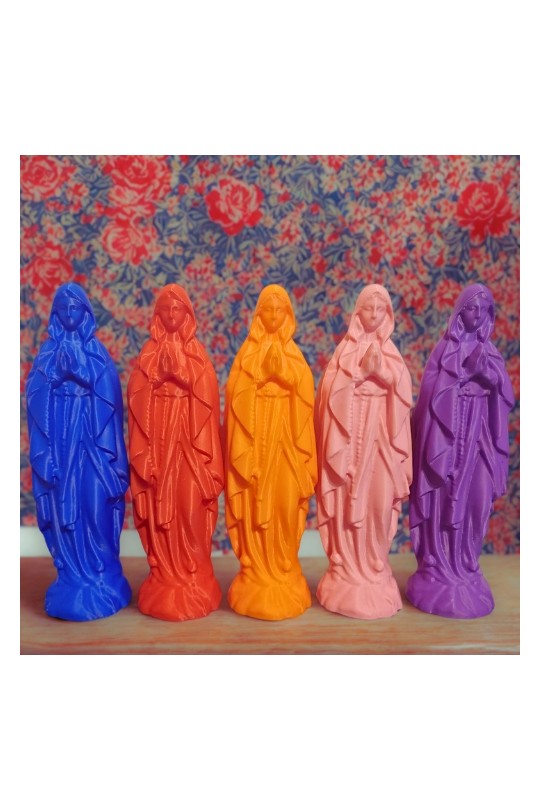 Imagine une Vierge au look totalement revisité : une silhouette traditionnelle, mais habillée de couleurs intenses