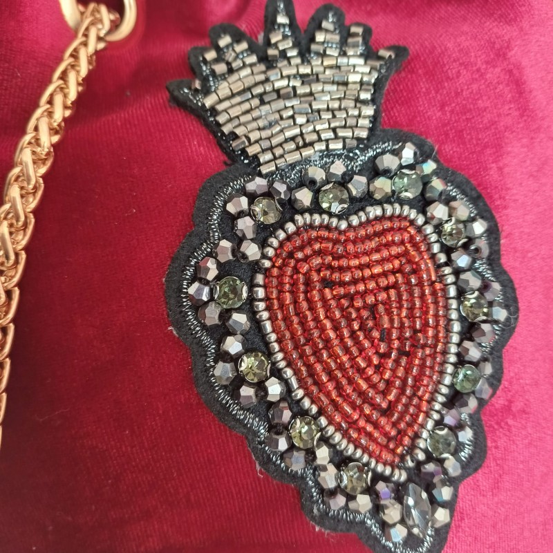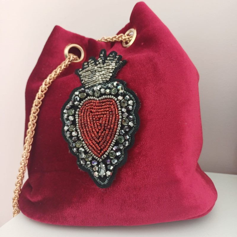 Pièce Unique: Bourse en Velours & Cœur sacré mexicain perlé