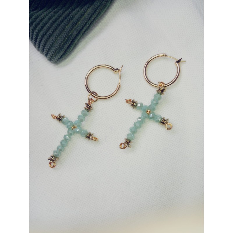 Boucles oreilles créoles en acier inoxydable & pampille croix de perles de rocailles bleu gris et or…