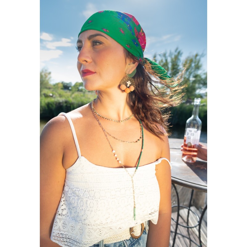 Il peut également être utilisé comme foulard autour du cou, attaché à votre sac ou panier comme présenté (disponible sur l’eshop), noué à votre jean, en bandana, ou bandeau pour un look d’été…