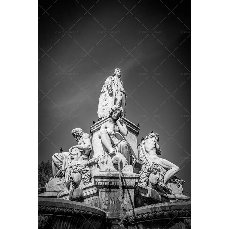Représente symboliquement la ville de Nîmes entourée des fleuves et des fontaines qui arrosent son territoire. La statue supérieure représente une femme drapée d’un péplum et coiffée d’une couronne. Elle personnifie la ville de Nîmes. Sa couronne représente en miniature, la Maison Carrée, les Arènes, le Palais de Justice et l’ancien théâtre. La légende à Nîmes veut que le visage de cette allégorie soit celui de Juliette Drouet, ancienne maîtresse de James Pradier qui avait quitté ce dernier pour Victor Hugo.